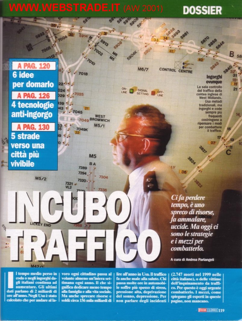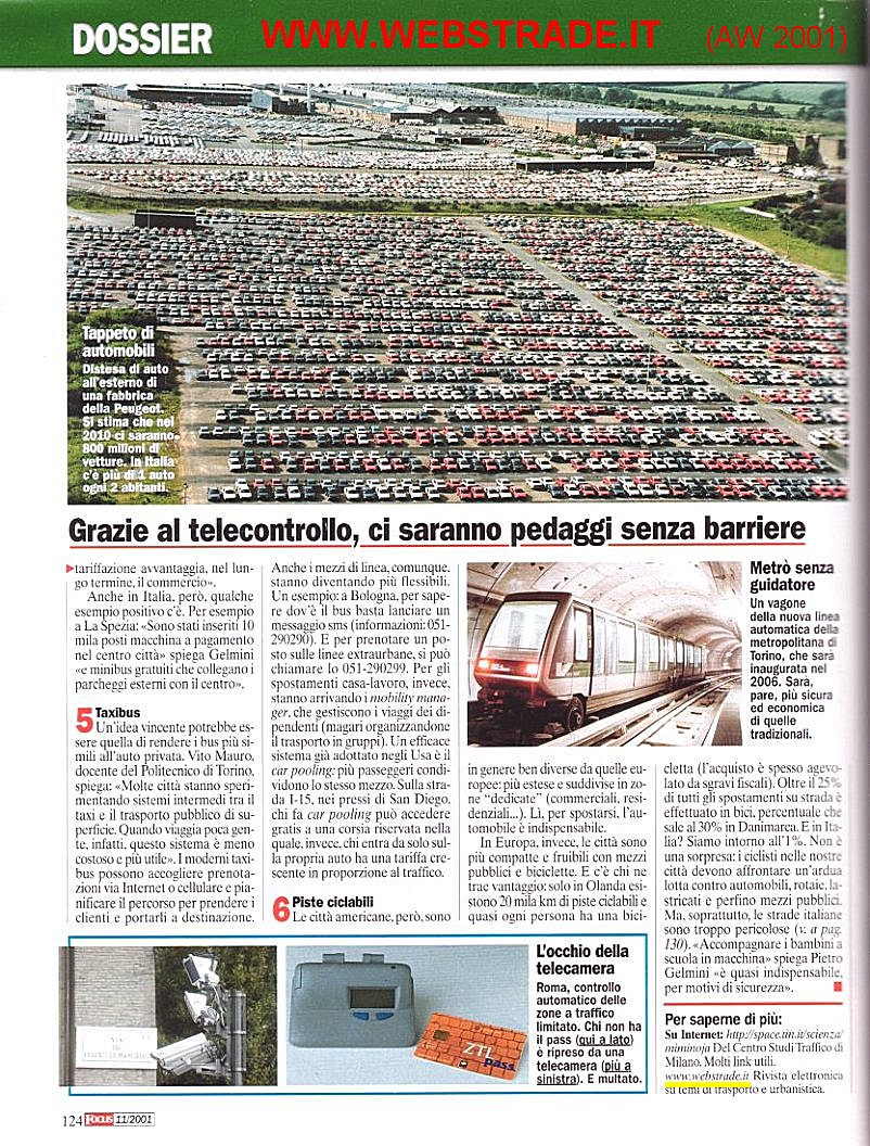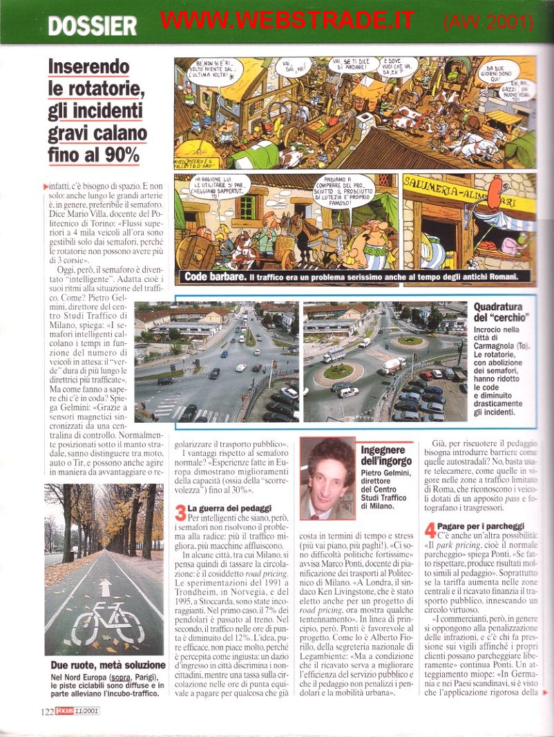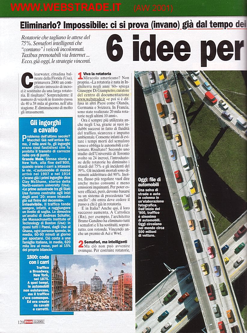 Uno speciale dl mensile FOCUS dedicato all'emergenza ormai cronica del traffico con una rassegna delle più innovative soluzioni tecnologiche per affrontarlo. Trai guru italiani dell'ingegneria del traffico, Mario Villa, Pietro Gelmini, Marco Ponti, Bruno Gandino, Vito Mauro, Giuseppe Villoresi, viene intervistato anche Giuseppe Di Giampietro curatore del sito WEBSTRADE.IT. In particolare si illustrano gli effetti dell'introduzione di rotatorie precedenza all'anello, la moderazione del traffico, le zone 30 in Germania. Le 6 idee proposte per gestire il traffico sono: rotatorie, semafori intelligenti, road pricing, park pricing, bus a chiamata, piste ciclabili. 4 tecnologie di gestione sono proposte: informazione all'utenza, tunnel e reti sottosuolo, autostrade automatiche, auto a guida automatica. 6 soluzioni per una città più vivibile: Zone 30, semafori salva pedoni, passaggi pedonali luminosi, motori ecologici, asfalti fonoassorbenti. | ||