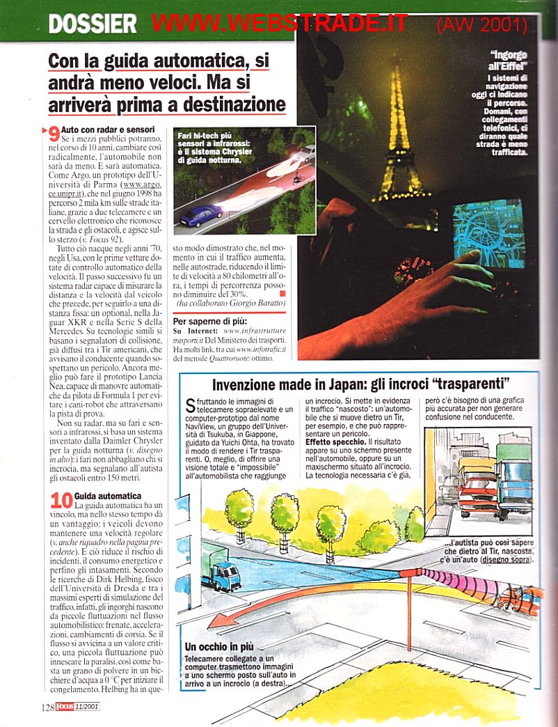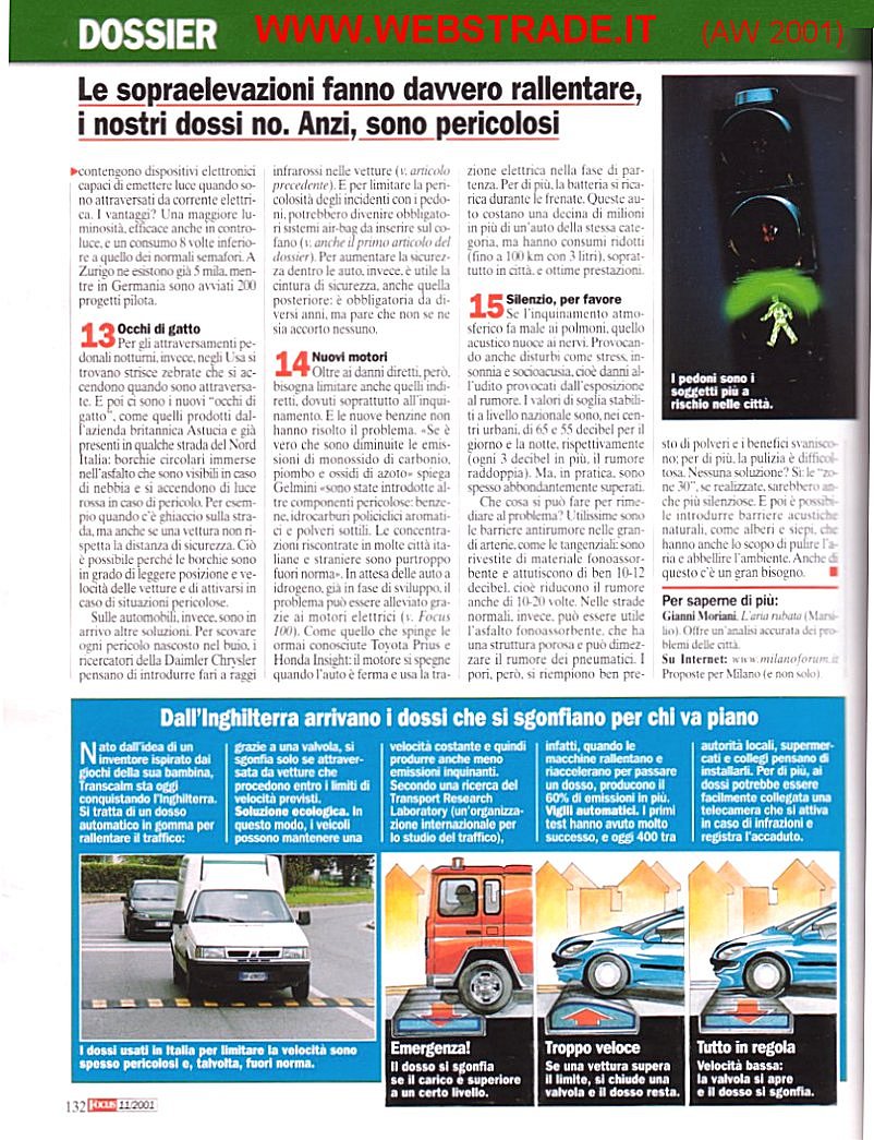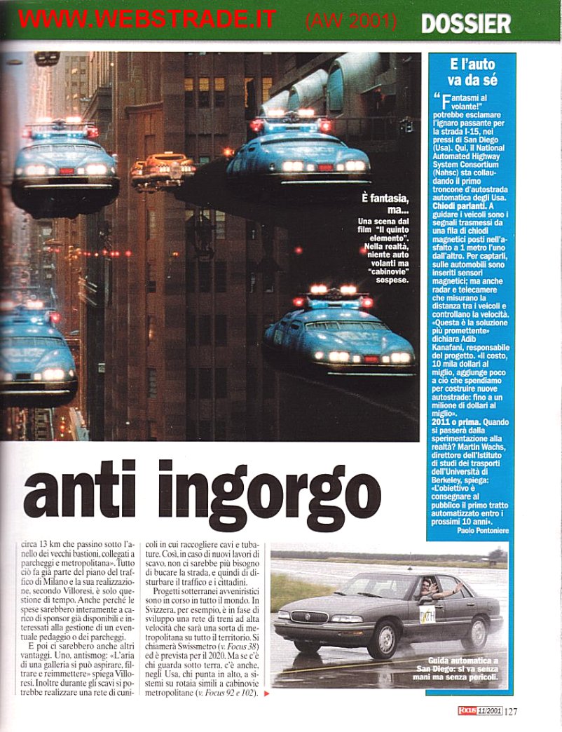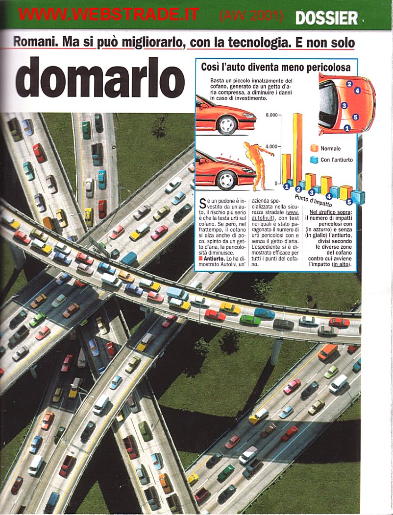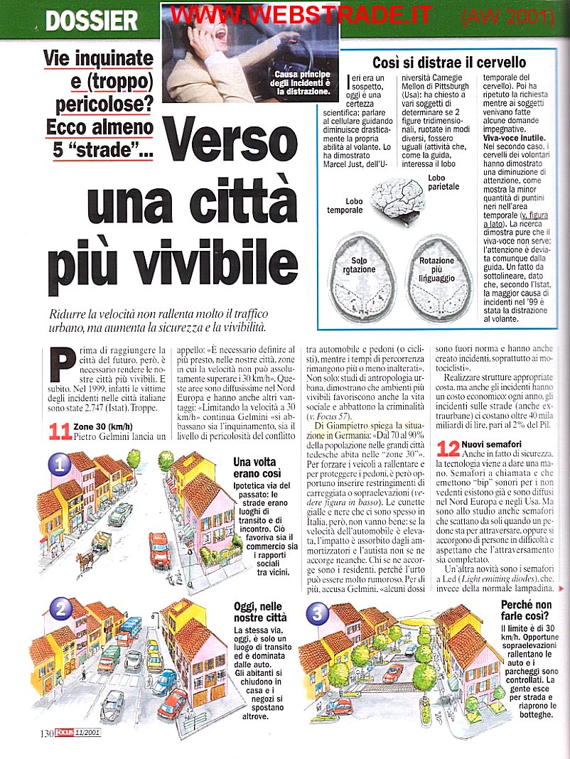 Uno speciale dl mensile FOCUS dedicato all'emergenza ormai cronica del traffico con una rassegna delle più innovative soluzioni tecnologiche per affrontarlo. Trai guru italiani dell'ingegneria del traffico, Mario Villa, Pietro Gelmini, Marco Ponti, Bruno Gandino, Vito Mauro, Giuseppe Villoresi, viene intervistato anche Giuseppe Di Giampietro curatore del sito WEBSTRADE.IT. In particolare si illustrano gli effetti dell'introduzione di rotatorie precedenza all'anello, la moderazione del traffico, le zone 30 in Germania. Le 6 idee proposte per gestire il traffico sono: rotatorie, semafori intelligenti, road pricing, park pricing, bus a chiamata, piste ciclabili. 4 tecnologie di gestione sono proposte: informazione all'utenza, tunnel e reti sottosuolo, autostrade automatiche, auto a guida automatica. 6 soluzioni per una città più vivibile: Zone 30, semafori salva pedoni, passaggi pedonali luminosi, motori ecologici, asfalti fonoassorbenti. | ||
